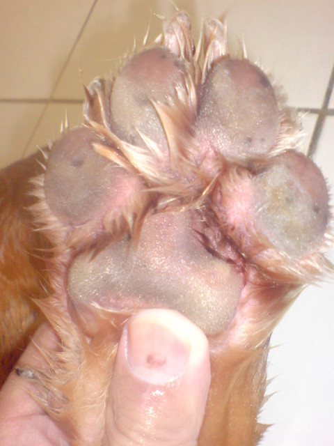 他的肉墊是屬於粉紅色的,很嫩,沒有粗硬的角質;感覺都是在家裡踩磁磚,或是地毯的好命狗。
