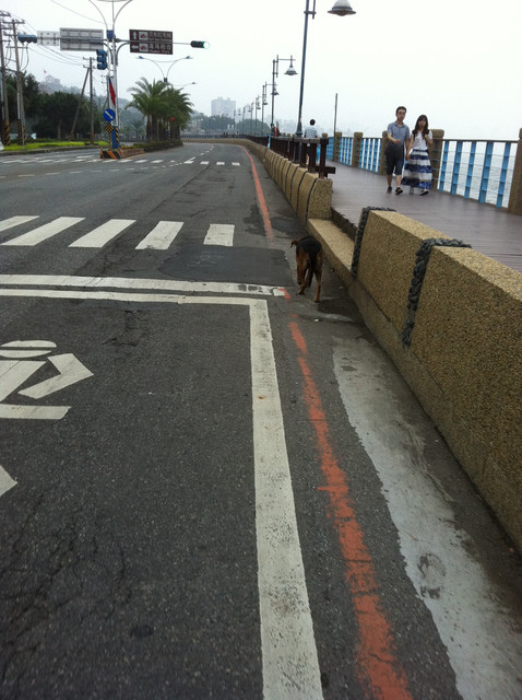 前天,在我出外覓食完要返家的時候,我在忠烈祠的大馬路上遇見了一隻流浪狗,一隻站在馬路中央,擋住所有車輛去路的流浪狗。他不理會所有汽車、機車的喇叭聲,還有駕駛人幾句低聲咒罵的粗鄙言語,逕自地站在馬路中央。我在等紅燈的時候看了好一會,幾乎所有的車輛都將道路讓給了他,開車離去。
