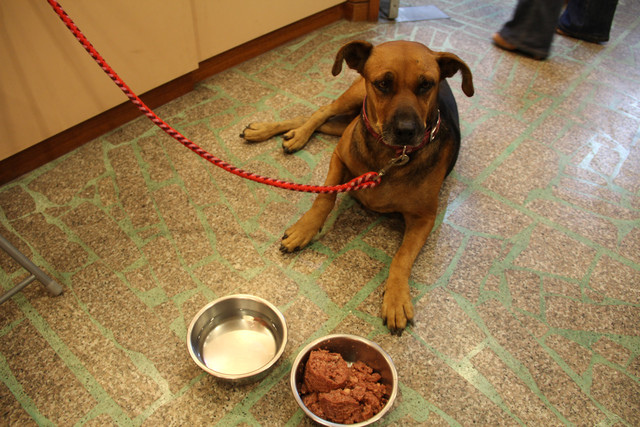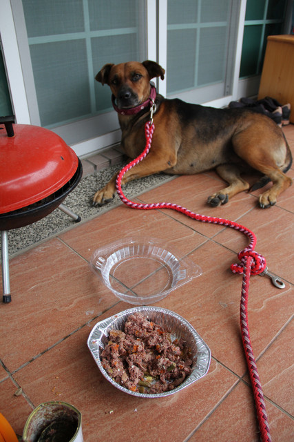 我準備了水與罐頭肉給狗狗吃,只是她好像不為所動,不怎麼愛吃。