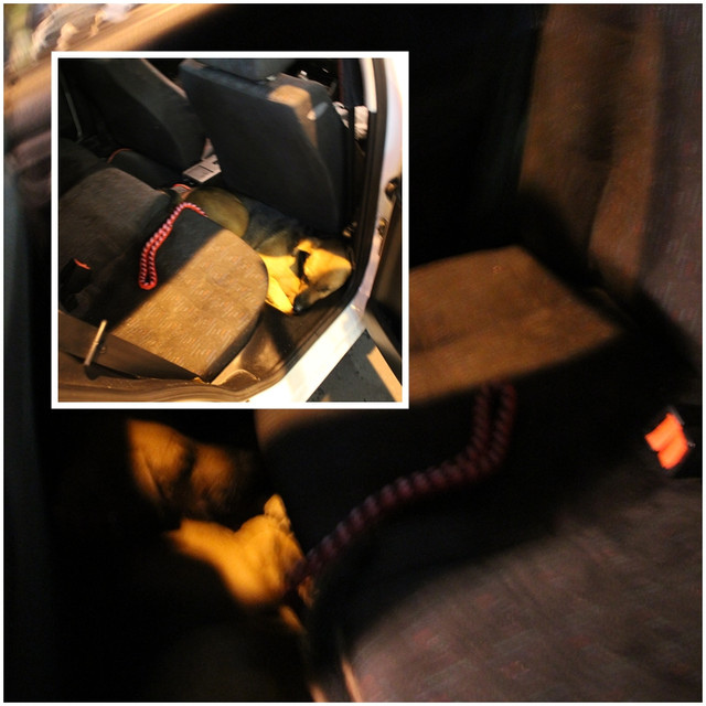 因為路途的顛簸,原本坐在後座的她,將身體塞進椅墊的下方,在車子裡睡著了。