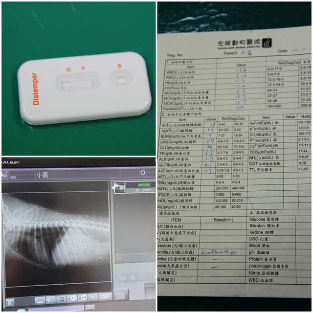 全身抖動的狀況,也讓我擔心會不會是犬瘟,我們做了幾樣基礎的檢查,有犬瘟篩檢,血液檢查,X光片的拍攝,除了白血球偏高些,其餘結果都是正常的。