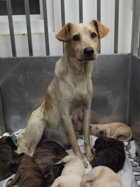 照片中消瘦的她,身上掛著一串腫脹的乳房與剛生下一窩狗狗,甚至收容所裡籠內的空間都被小幼犬佔據了,她還不忘哺育母乳。