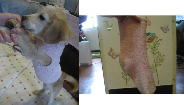 Lisa怕她沒有毛的小肚子,趴在地上會冷,就用襪子剪開兩個洞,給她當衣服穿。