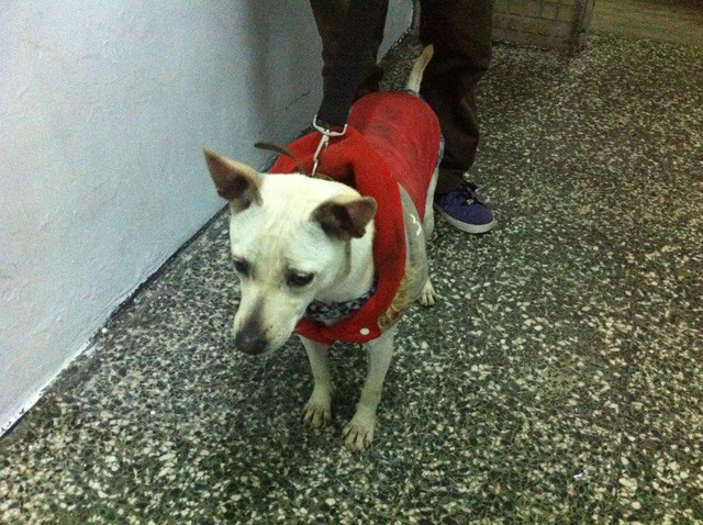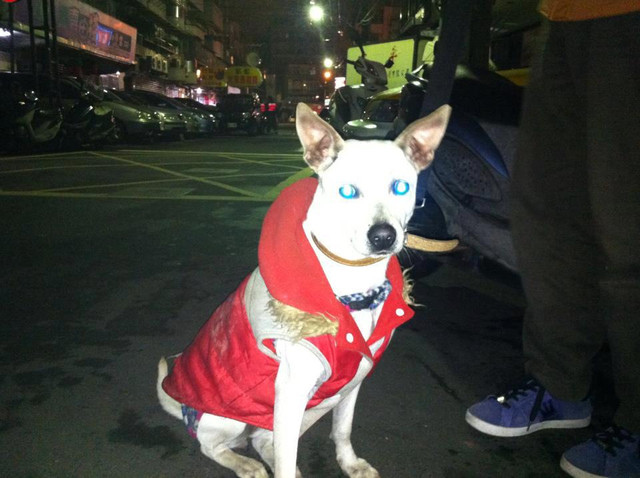 06. 毛色 or 明顯特徵:米白色、穿著紅色小帽背心印有白色「enjoy outside」字樣帶有咖啡色皮製項圈,無其他掛飾。