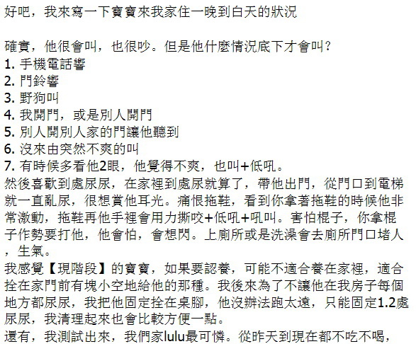只是他的性情與反應,讓一些認養人措手不及,以下是Carol(珮伶)寫下的寶寶狀況