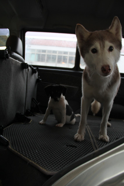 說也奇怪,過去一直躲我躲遠遠的母哈士奇,一看到我抱著小幼幼上車,她也二話不說地跳上車子。