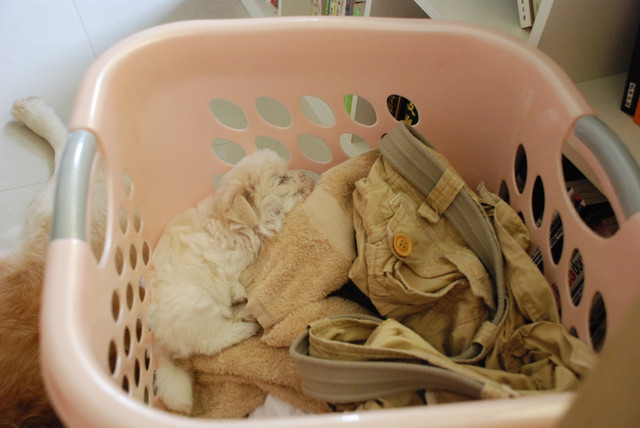 當時我也擔心這個小孩到處跑,而且很愛亂叫,所以都把他丟在我的洗衣籃裡面讓他睡覺。