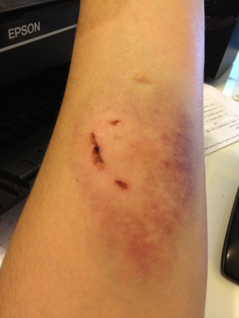 我的這隻手,是在強勢分開已經殺紅眼的兩人時被咬傷的,是大頭咬的,應該是不小心,因為一咬到我的手時,他馬上就鬆口了。
