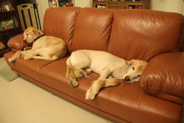 當時老闆送來這座沙發時,看到我們家的小朋友們,就問說:「先生,你這個沙發該不是要給狗狗坐的吧?」
