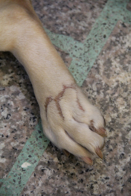 當初妞妞的右後腳整個被輾爆了,後腳的痕跡是手術縫合過的痕跡,