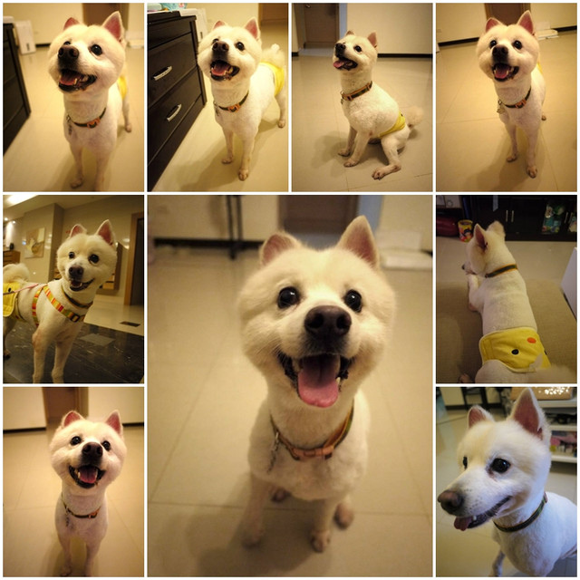目前每天帶他上兩次廁所,在家裡雖然會使用尿盆,但還是會四處作記號,照片中的黃色小鴨就是禮貌帶,防止他亂做記號用的。